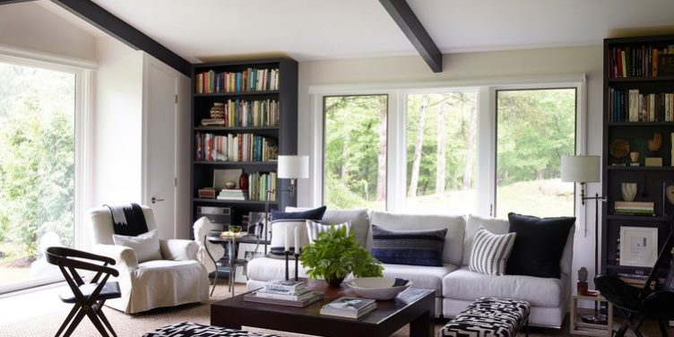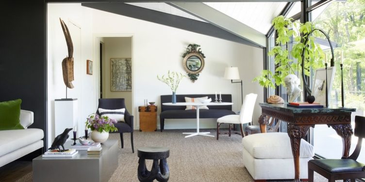One might find it rather curious that a classically minded interior designer like Matthew Patrick Smyth would leave his beloved 18th-century weekend retreat in Sharon, Connecticut, for a neglected 1970s prefab in the woods. But when he was notified of a price reduction on the listing he had been tracking in nearby Salisbury (Smyth is a self-proclaimed real estate junkie), he didn’t think twice. “I immediately went to see the property and ended up buying it that same day,” says the Manhattan-based Smyth, who also keeps an apartment in Paris. “My friends thought I was crazy, but I needed a change and I wanted the challenge of tackling a ranch house like this.” The 2,200-square-foot residence, originally constructed for a Pan Am pilot by the custom prefab company Deck House (now Acorn Deck House Company), fell into disrepair after having been rented out for years. “The home was a mess, with layers of linoleum, avocado green appliances, a hot tub, a steam room, and a dated stone fireplace,” recalls Smyth, “although I’m sure it was quite the jazzy bachelor pad when it was first built. It still had a good energy about it that I felt right away.”