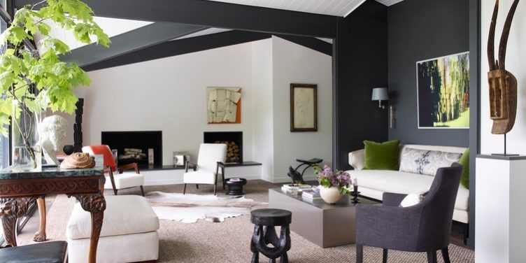 Smyth traded in the living area’s original stone fireplace for a sleek and simple version. “It was very dated,” he says of the previous incarnation. An African mask from Sutter Antiques and a vintage Indian stool from Comerford Collection lend interest to the streamlined seating. The abstract photo above the sofa is by Smyth.