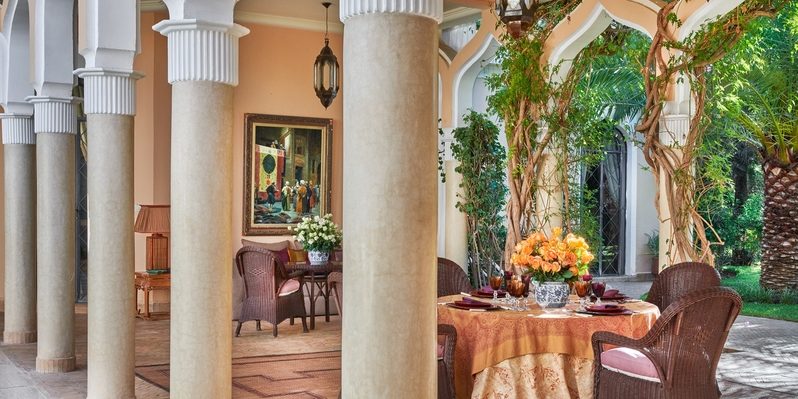 At the home of the Marquess Franco Santasilia Di Torpino and his wife, Rafaella, India-inspired decor blends with traditional Moroccan elements. “Marrakech allows you to live outdoors in a very sophisticated way,” says Loum-Martin. “There is this kind of outdoor refinement, which I love.”