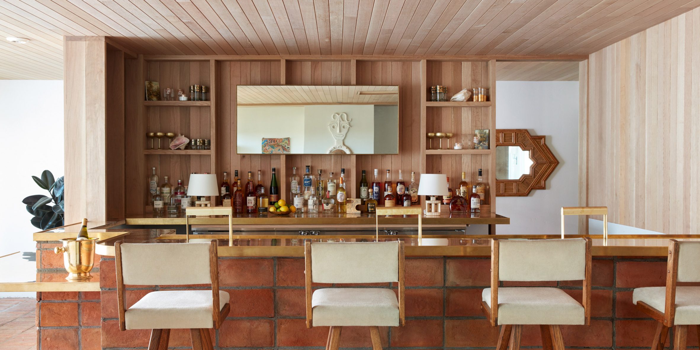 Folding glass doors open the eatery onto a terrace overlooking the ocean, featuring caned chairs and wooden tables for guest to relax. Terracotta-hued tiles cover the floor of the outdoor area and run inside, where they also line the base of the golden bar top.